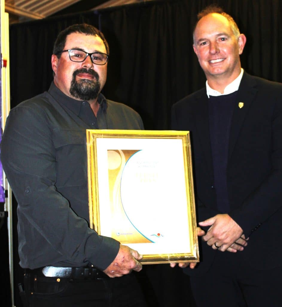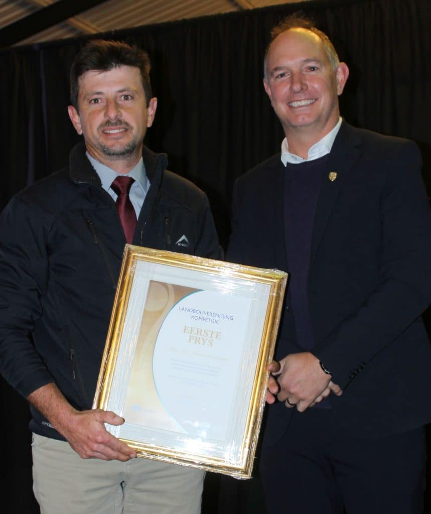 Tydens die Agri NK-kongres is die Mac Mac-landbouvereniging van Kathu aangewys as die provinsie se top landbouvereniging. Hier ontvang Eben Anthonissen (links) die prys van Brendon Jacobs van Standard Bank, die prysborg.