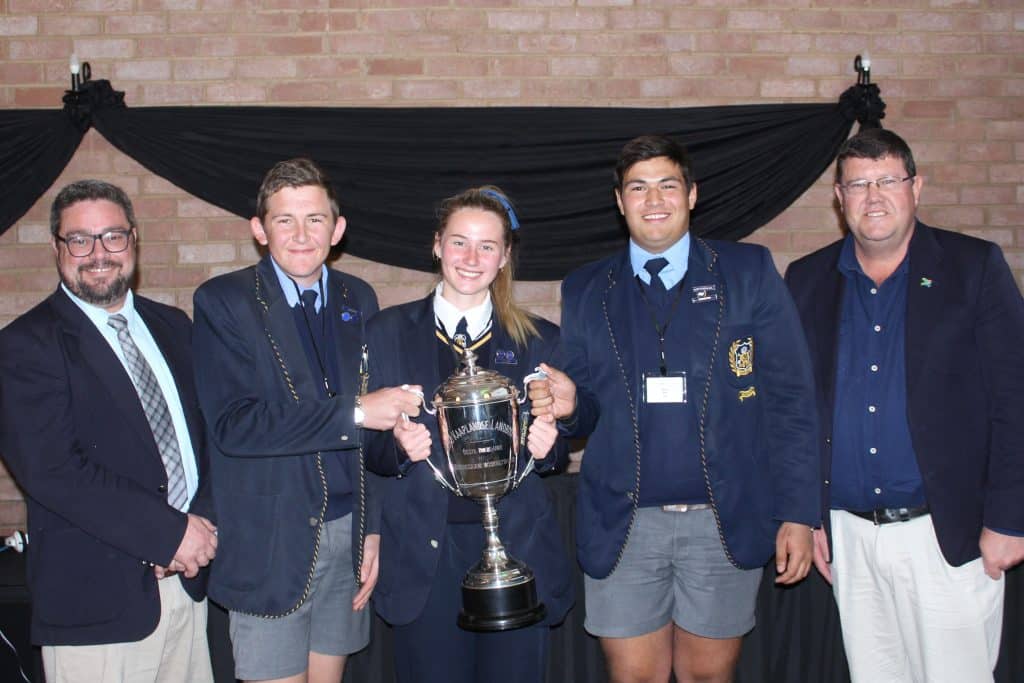 Dit is ’n instelling om jaarliks leerders van verskillende landbouskole na die Agri NK-kongres te nooi en vir hulle ’n mini-redenaarskompetisie aan te bied. Vanjaar het die sprekers van Hoërskool Martin Oosthuizen van Kakamas met die louere weggestap. Op die foto is Dirk Krapohl, hoof uitvoerende bestuurder van Agri NK, leerlinge Bennie Mans, Shandré Steenkamp en Stephan Maritz, en Jaco Minnaar, president van Agri SA.