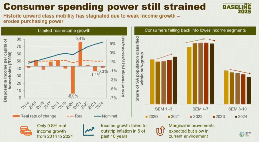 Field crop margins are expected to tighten, with production stabilising unless new demand emerges from feed or export markets. Narrow margins will especially constrain emerging farmers, many of whom lack effective support, access to credit, and insurance. Large areas with potential for commercial production remain underutilised due to weak or non-existent extension services.