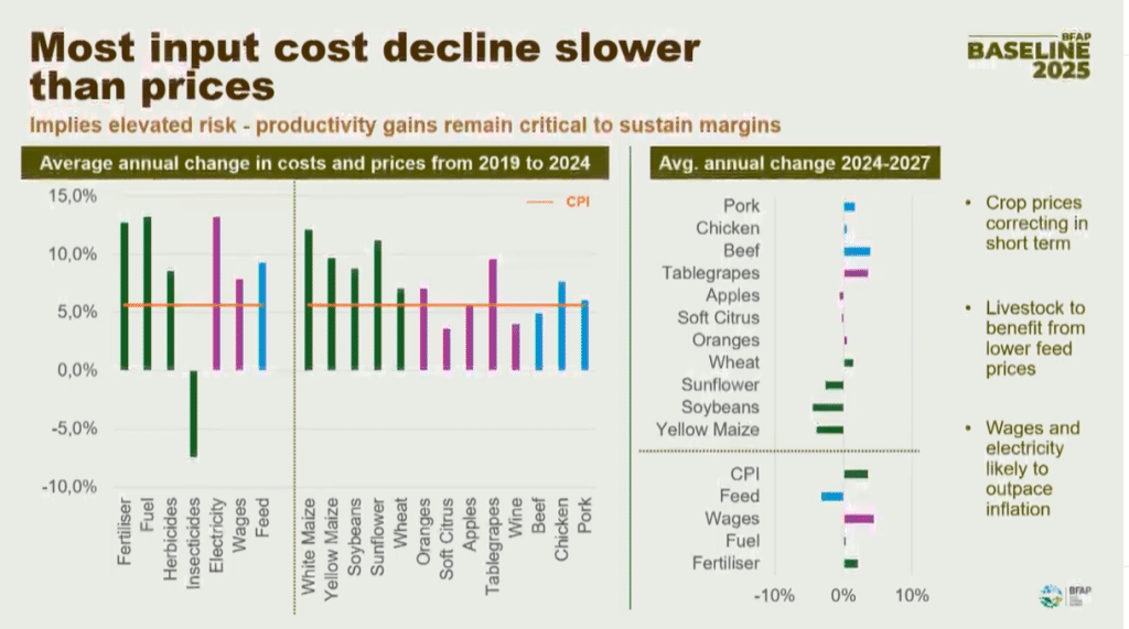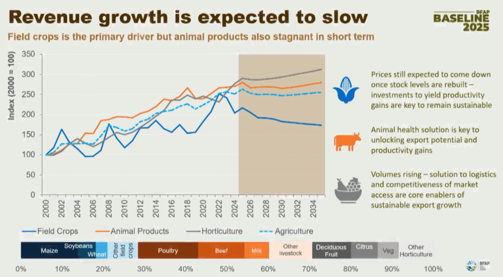 The BFAP team is expecting revenue growth to slow down between 2025 and 2035. “Field crops are the primary driver, but animal products will also become stagnant in the short term,” she said.
