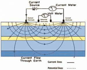 A representation of how resistivity can be used to find evidence of underground water.