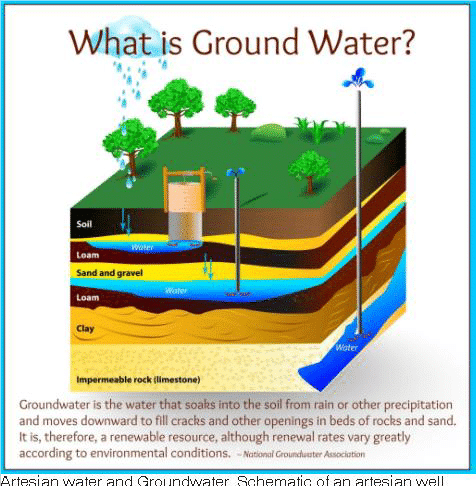 Groundwater is water that soaks into the soil from rain or other precipitation, from where it moves downward to fill cracks and other openings in beds of rock and sand. It is therefore a renewable resource, although renewal rates vary greatly according to environmental conditions (National Groundwater Association).