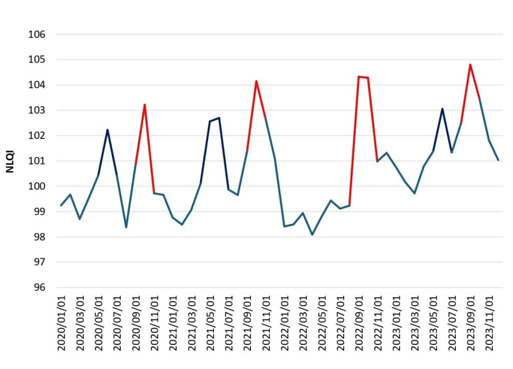 Variations in quality are illustrated in Figure 1. Superior quality lucerne hay is generally produced in August to September, marking the start of the production season, and again towards the end of the season in March to May. Data in Figure 1 are averages of analysis done over several years on all grading instruments across all production areas. Acquiring lucerne hay of superior quality in these months is common, with an analytical index grade exceeding 108 on the NLQI grading scale.