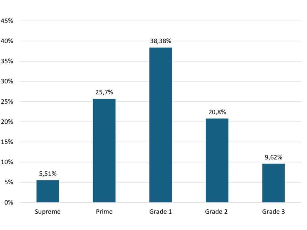 The quality distribution of South African lucerne hay is presented in Figure 2. The majority of annual production falls within grade 1 (38,38%), followed by prime grade (25,7%). Supreme grade lucerne hay is produced only during relatively short windows at the beginning and end of the production season. Lower quality grades are typically associated with unfavourable weather conditions during the production season, as well as challenges related to haymaking practices. – Dr Hermias van Niekerk, Department of Agricultural Economics, University of the Free State