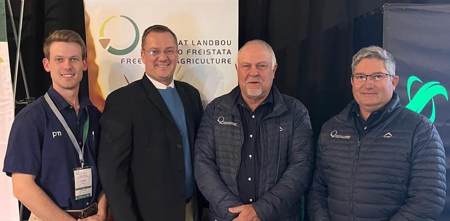 Van links is Hano Higgs, landbou-ekonomie student van die Universiteit van die Vrystaat, Gernie Botha, uitvoerende hoof van Vrystaat Landbou, Francois Wilken, die herkose president van Vrystaat Landbou, en Friedl von Maltitz, herkose visepresident van Vrystaat Landbou.