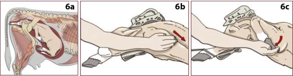 Kalwingstou moet aan die een voorbeen gesit word sonder om daaraan te trek. Die kop en bors van die kalf moet teruggedruk word en die hand en arm moet dan diep ingedruk word, oor die rug van die kalf. Die hand word dan aan die sykant van die kalf afgegly totdat die been wat teruggedraai is gevoel word. Die hand word oor die hoef geplaas (om die baarmoeder te beskerm), en dan word dit na die ingang van die geboortekanaal getrek (foto 6 b en c).