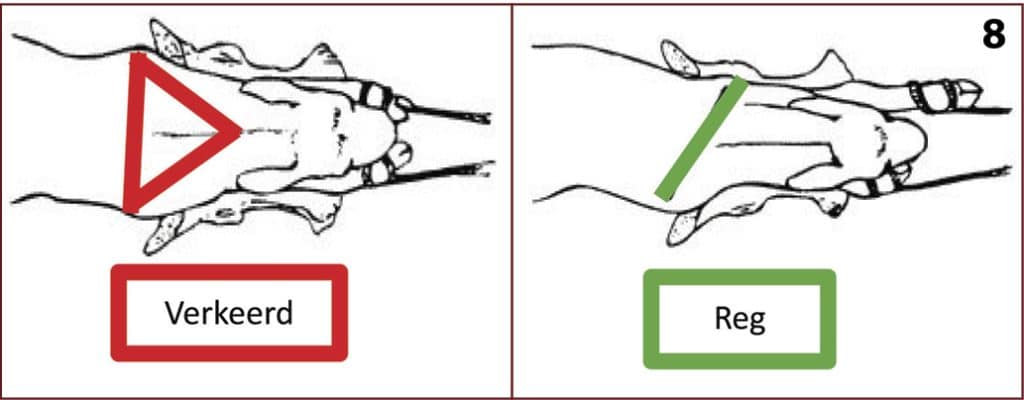 Eerste tegniek: Sit die kalwingstoue aan sodat die skuifknoop styf trek in die deel waar die voorpoot bo die kootgewrig verdun. Trek eers aan een voorbeen totdat dit ongeveer 10cm voor die ander been is (foto 8). Dit voorkom dat die twee skouerknoppe nie teenoor mekaar lê en ‘n wig vorm wanneer die kalf se skouers in die geboortekanaalingang ingetrek word nie.