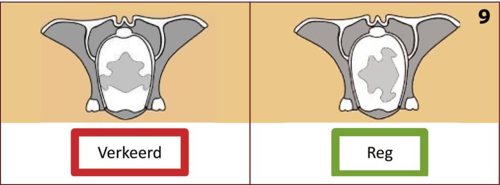 Een voorbeen teruggebuig: Die tweede mees algemene probleem kan gesien of gevoel word as net die neus en een voorbeen in die geboortekanaal is. Dit beteken dat die een voorbeen teruggebuig is. Die skouerknop haak nou in die ingang van die geboortekanaal vas (foto 6a). Die regstelling van hierdie verkeerde posisie is ‘n meer gevorderde prosedure, en indien nodig moet die kuddeveearts gekontak word. Die kalf mag nooit getrek word indien die posisie nie reggestel is nie, want dit kan nooit in die posisie uitkom nie.